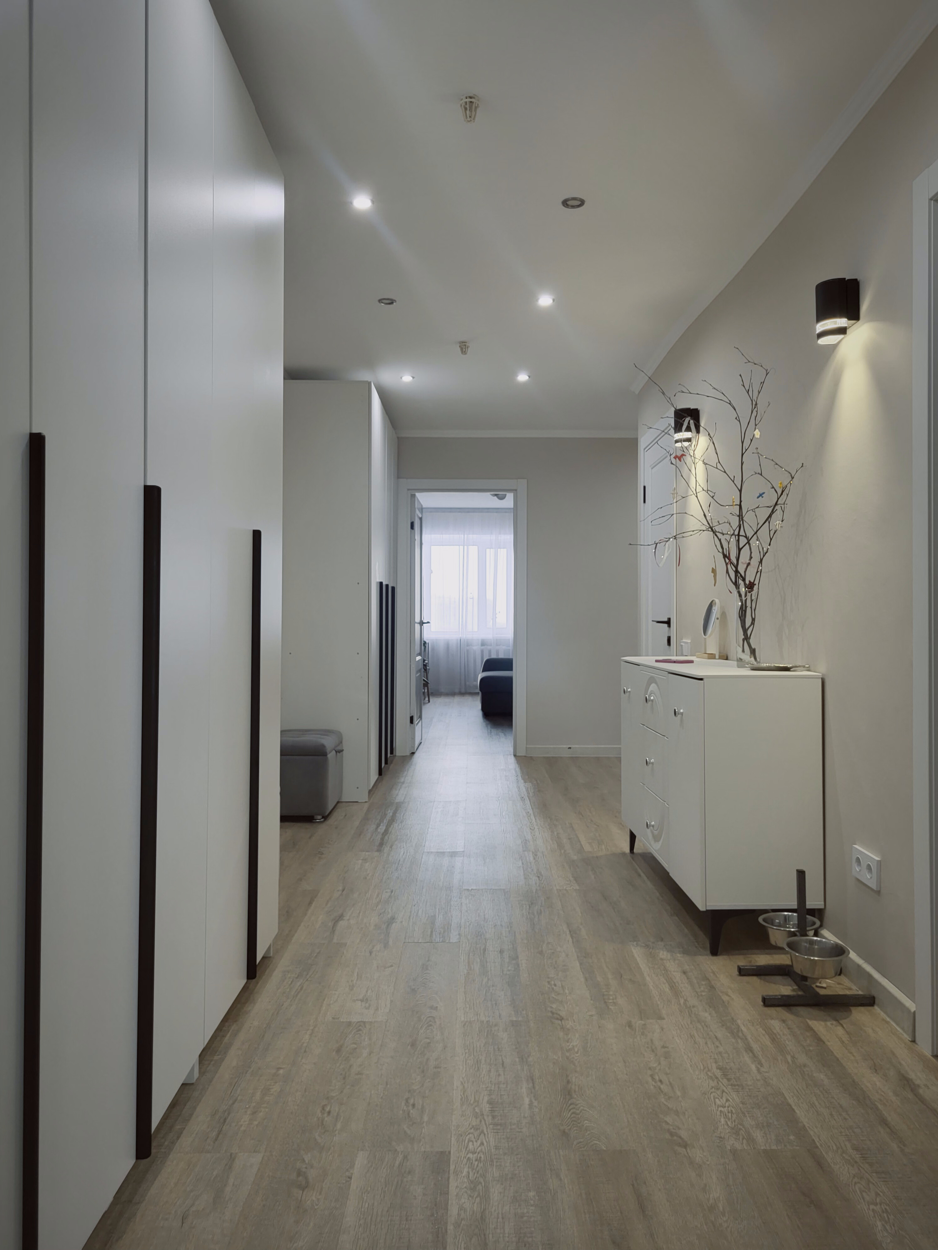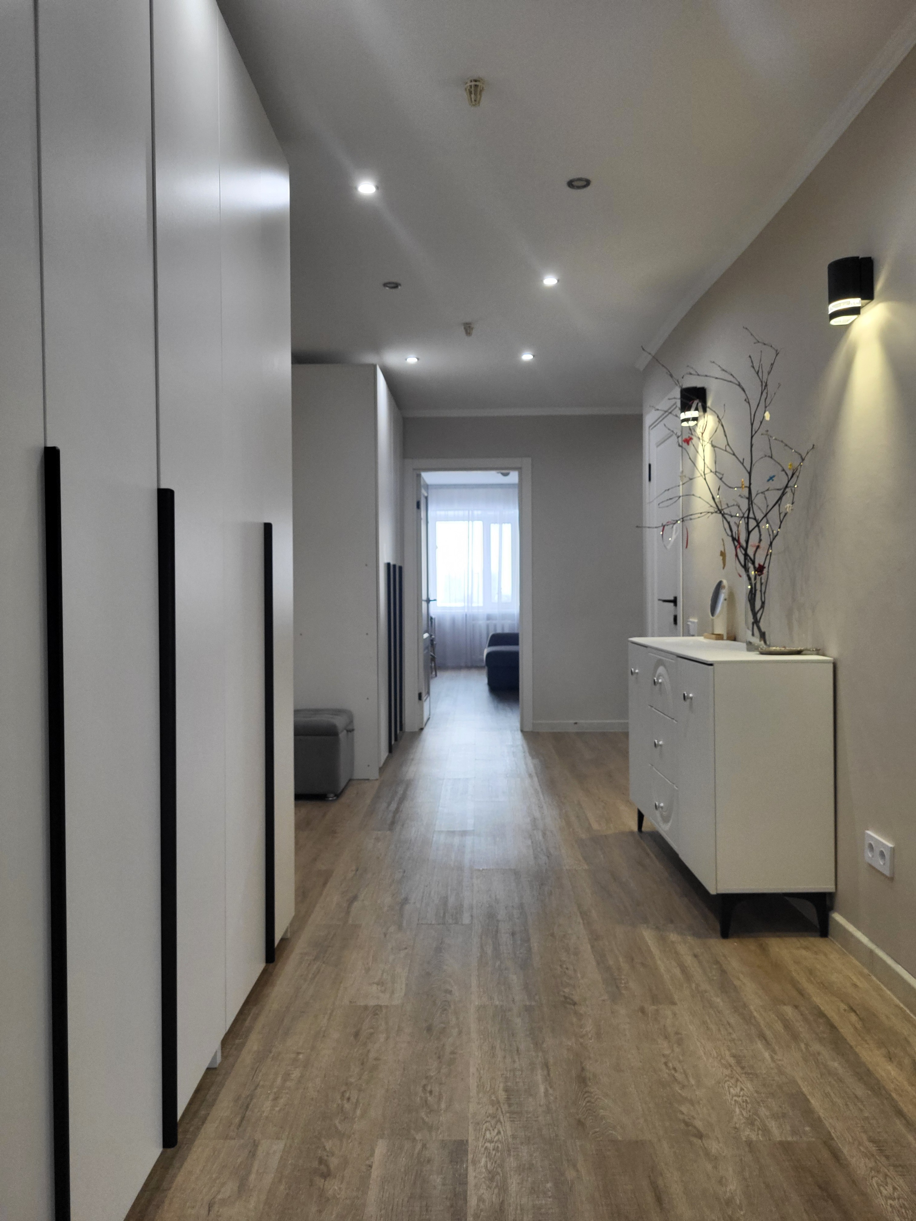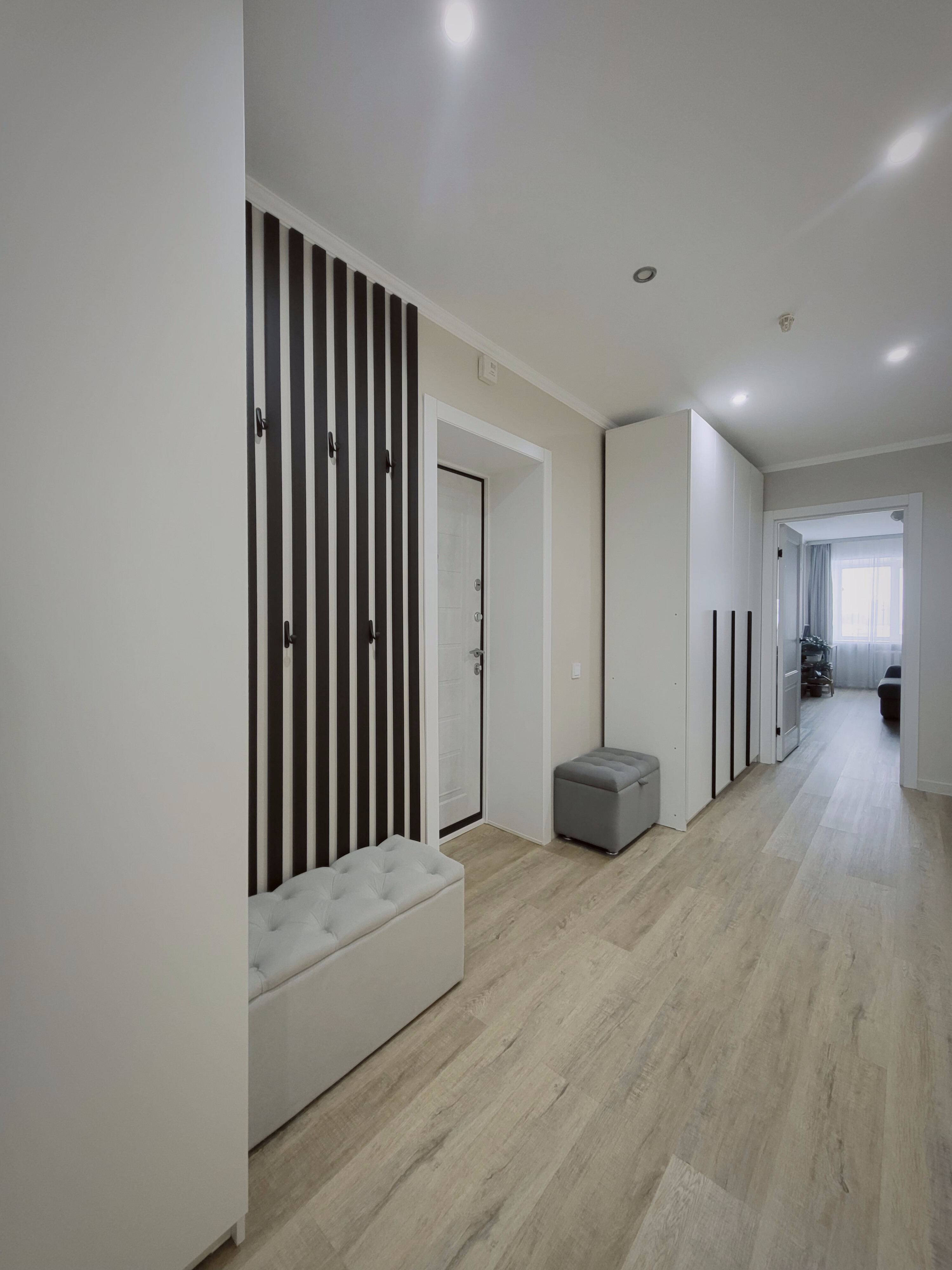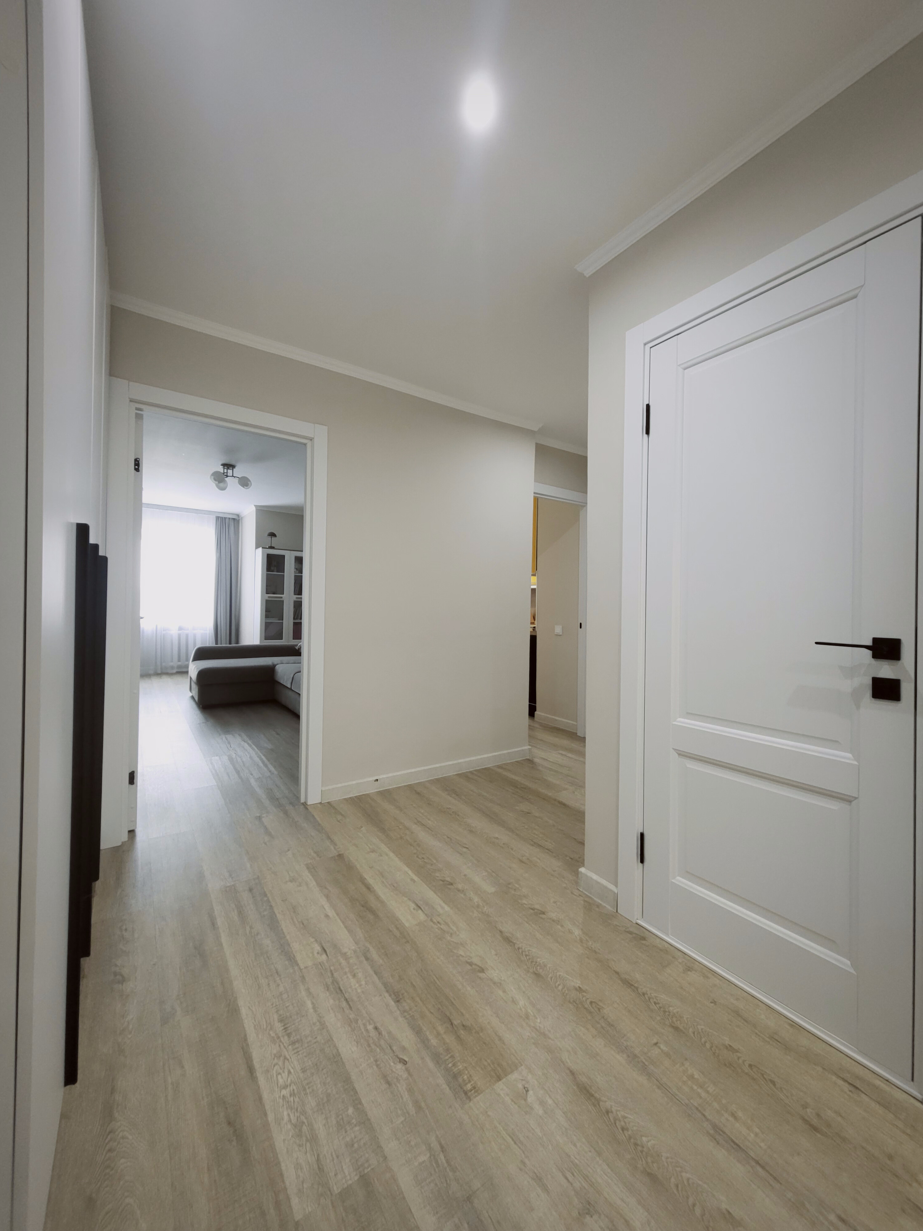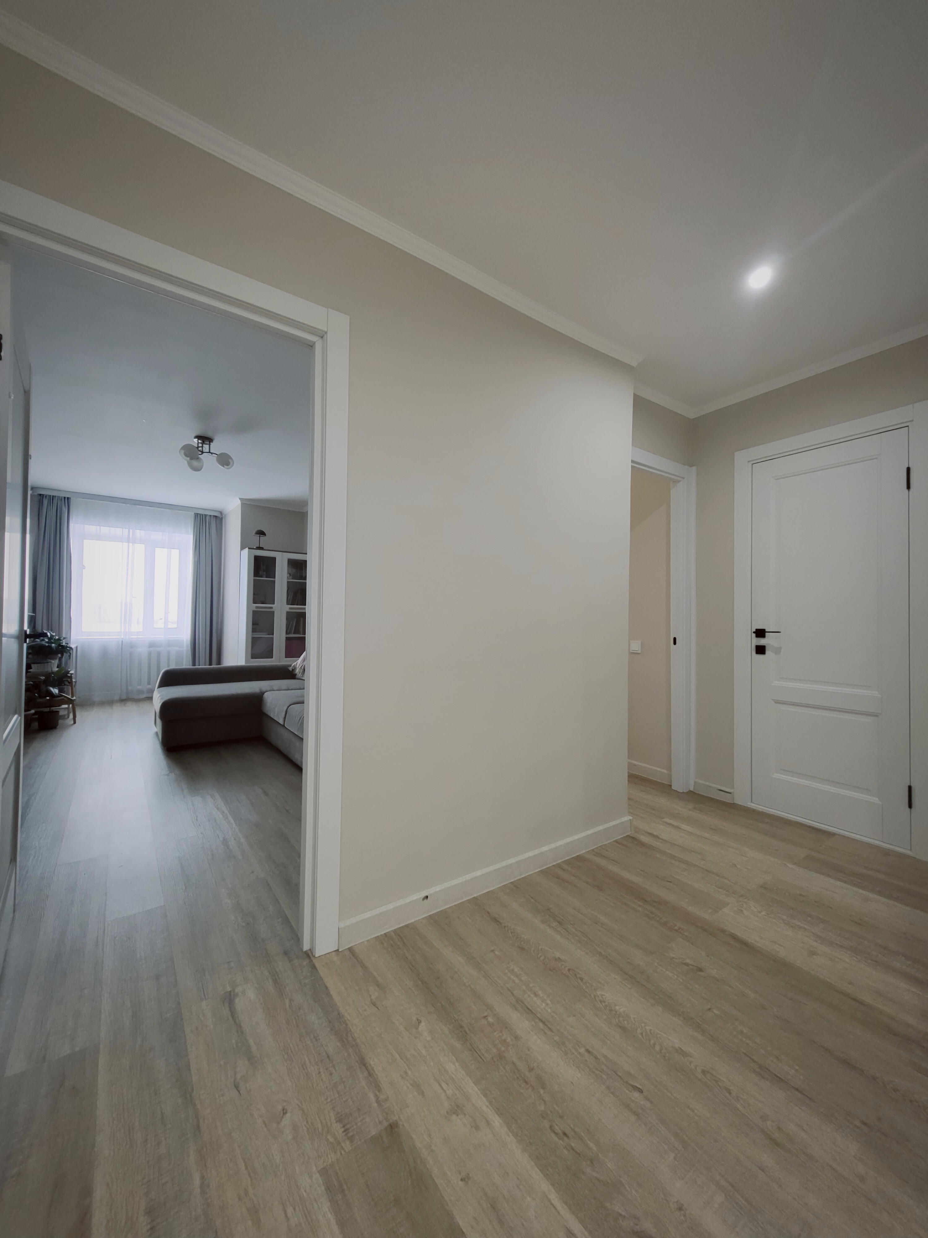 Выровнен пол стяжкой по всей площади квартиры под уровень, постелен ламинат в едином стиле.