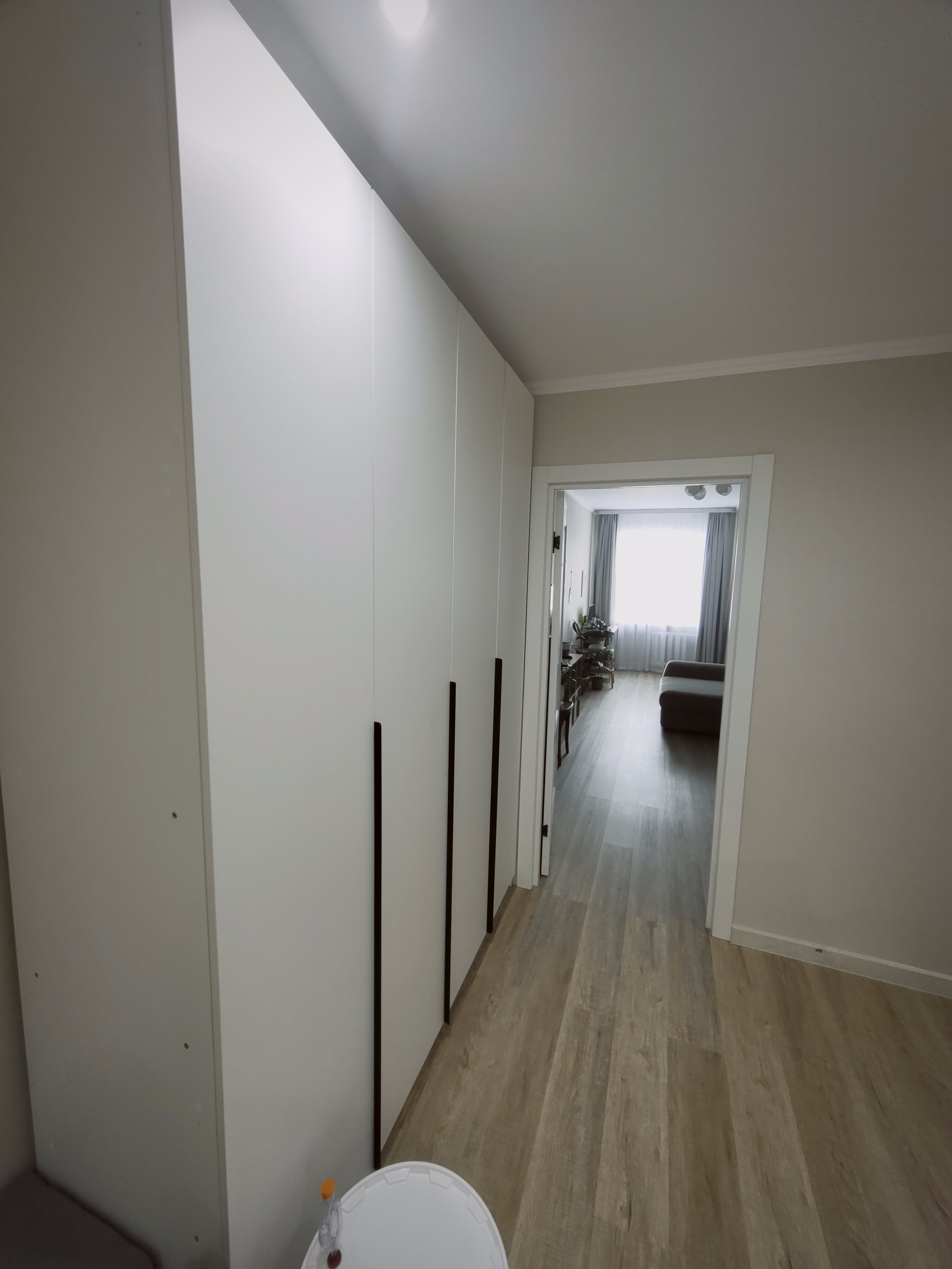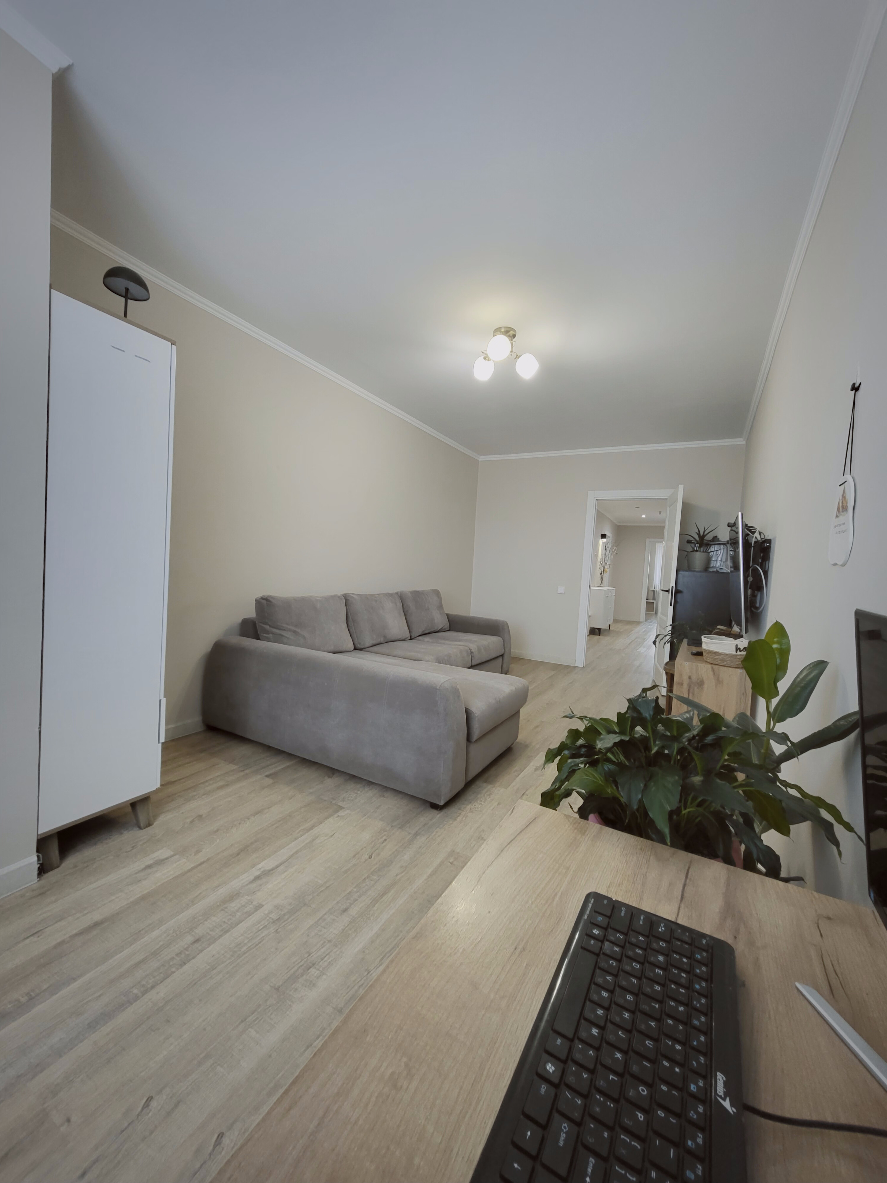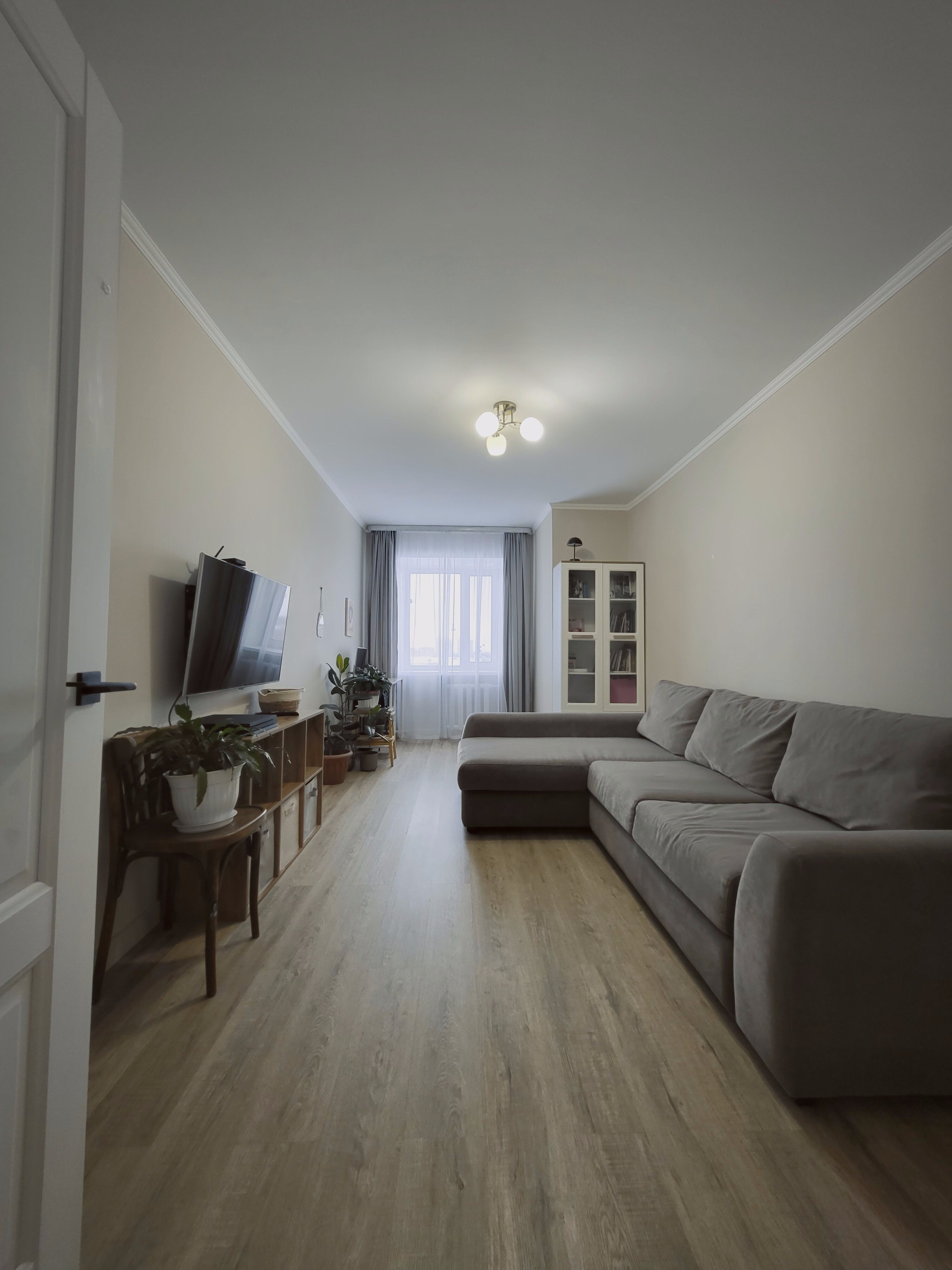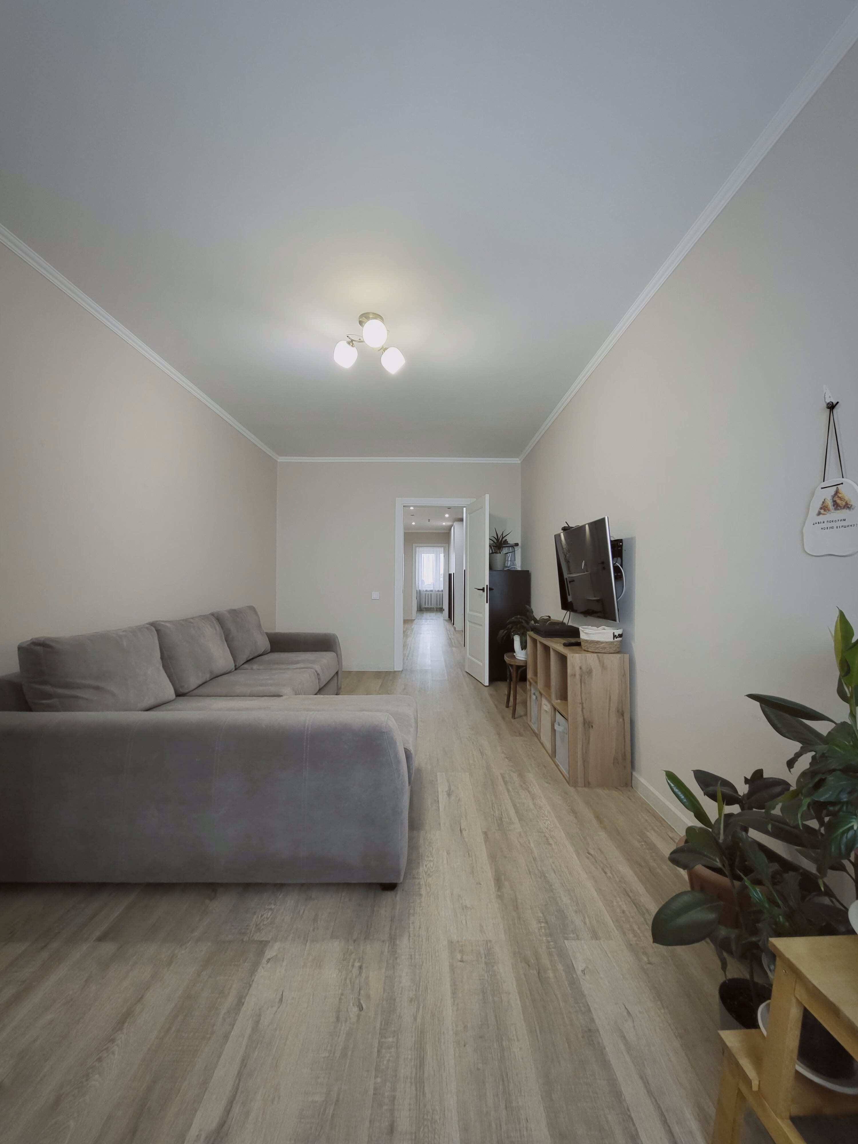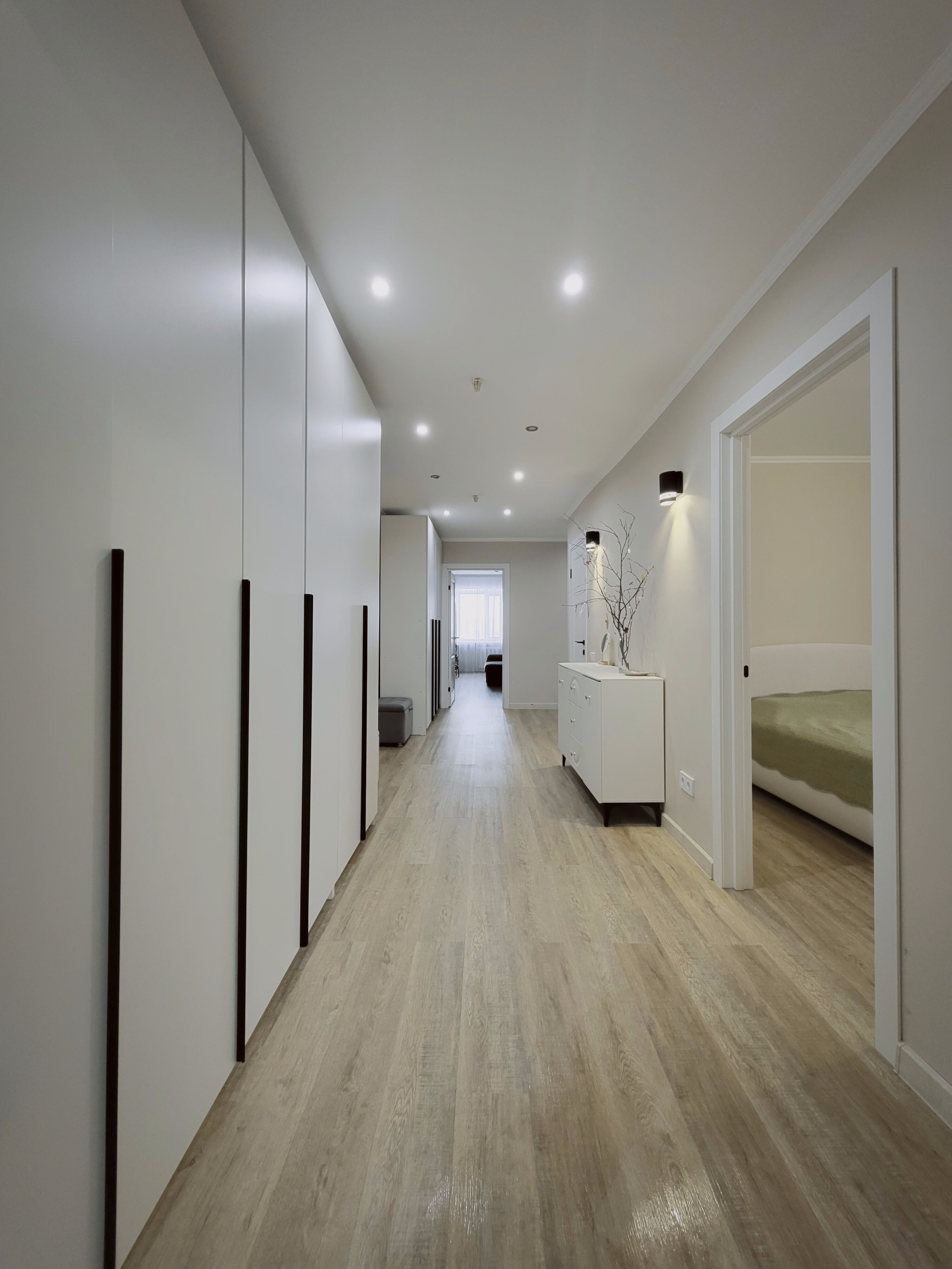 Выровнен пол стяжкой по всей площади квартиры под уровень, постелен ламинат в едином стиле.