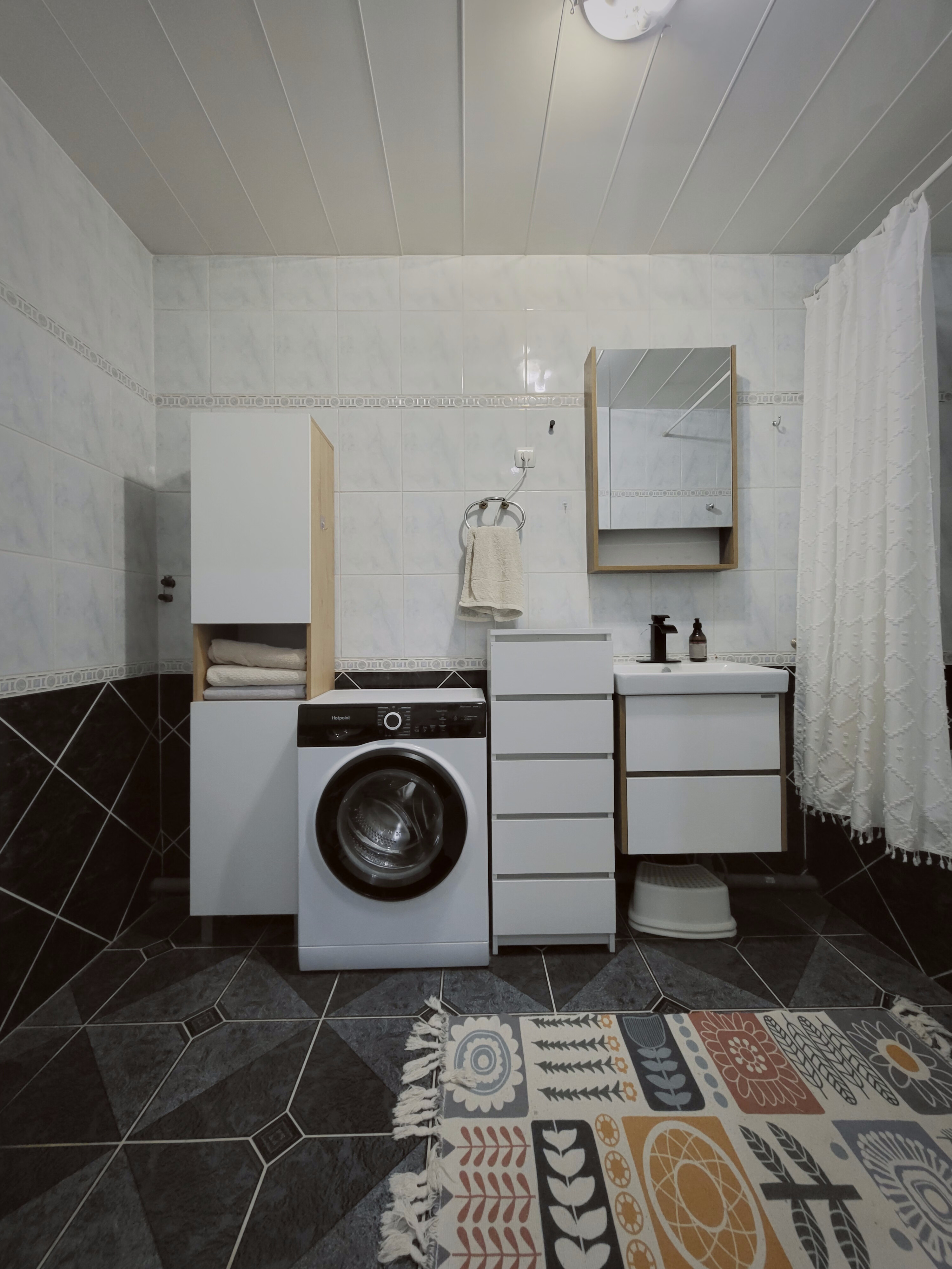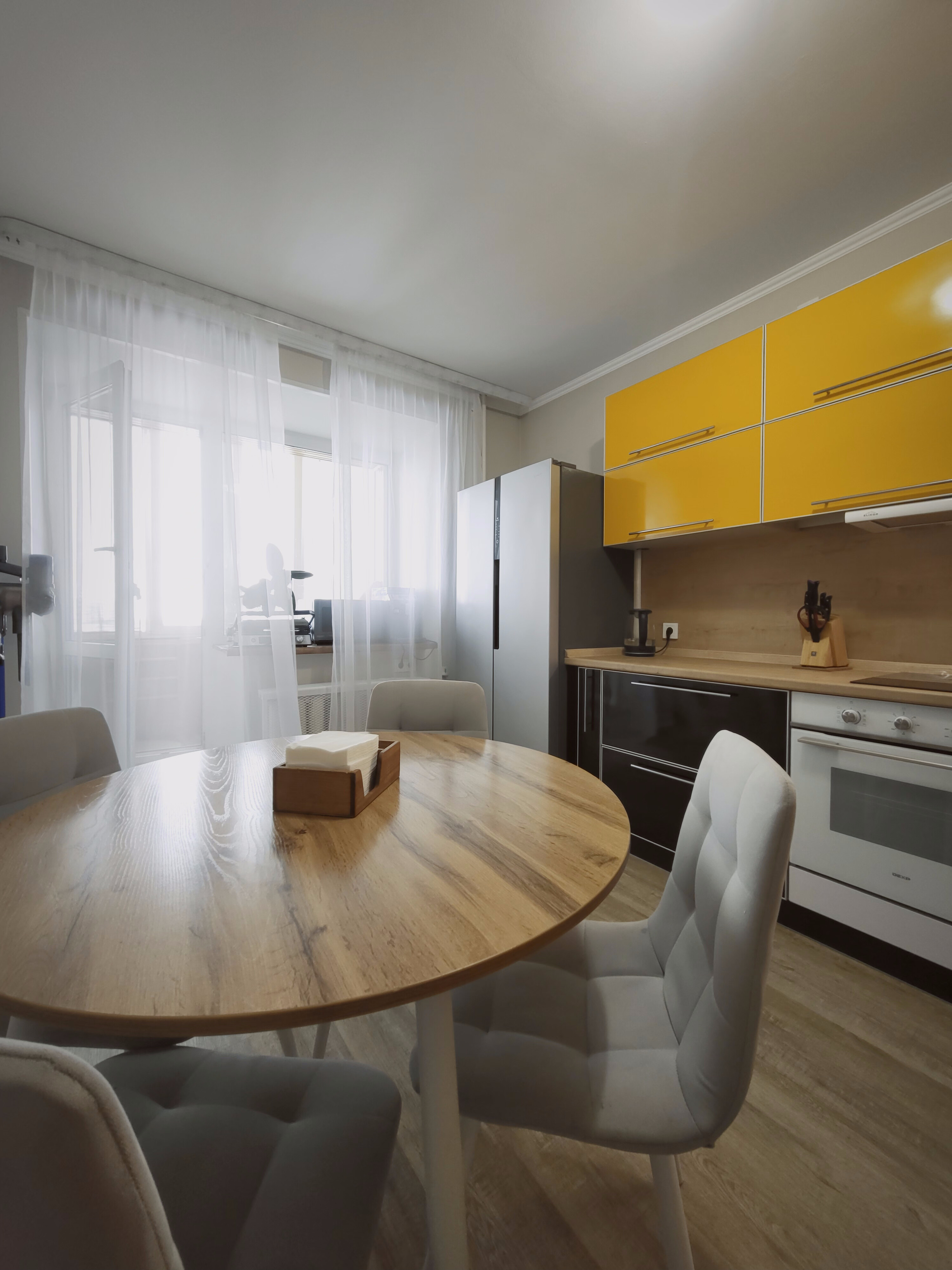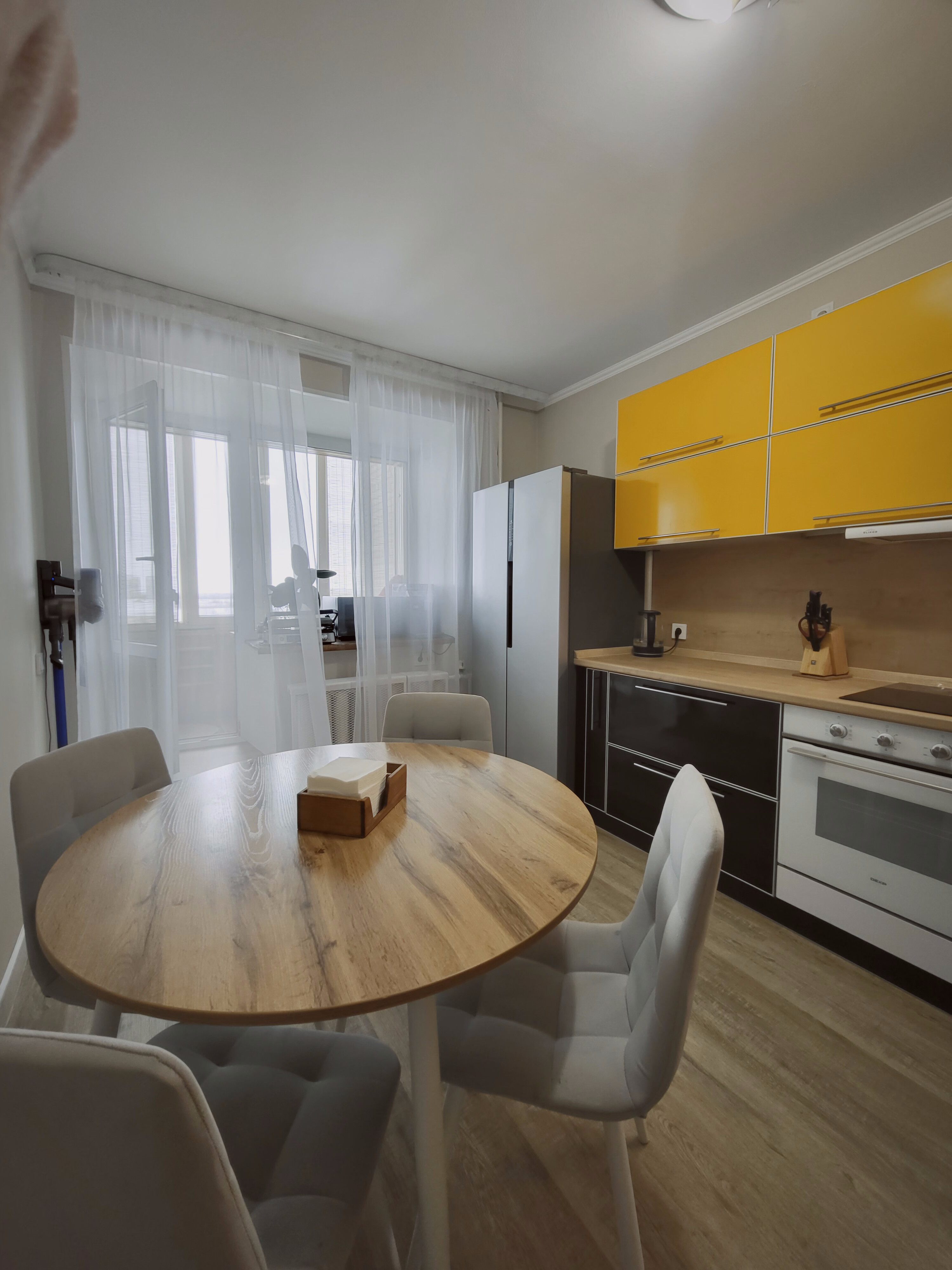 Установили современный кухонный гарнитур, встроенную технику подбирали индивидуально.